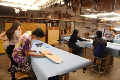 Pictured at top of page: Students who holding a skateboard made at the Sheridan workshop.
