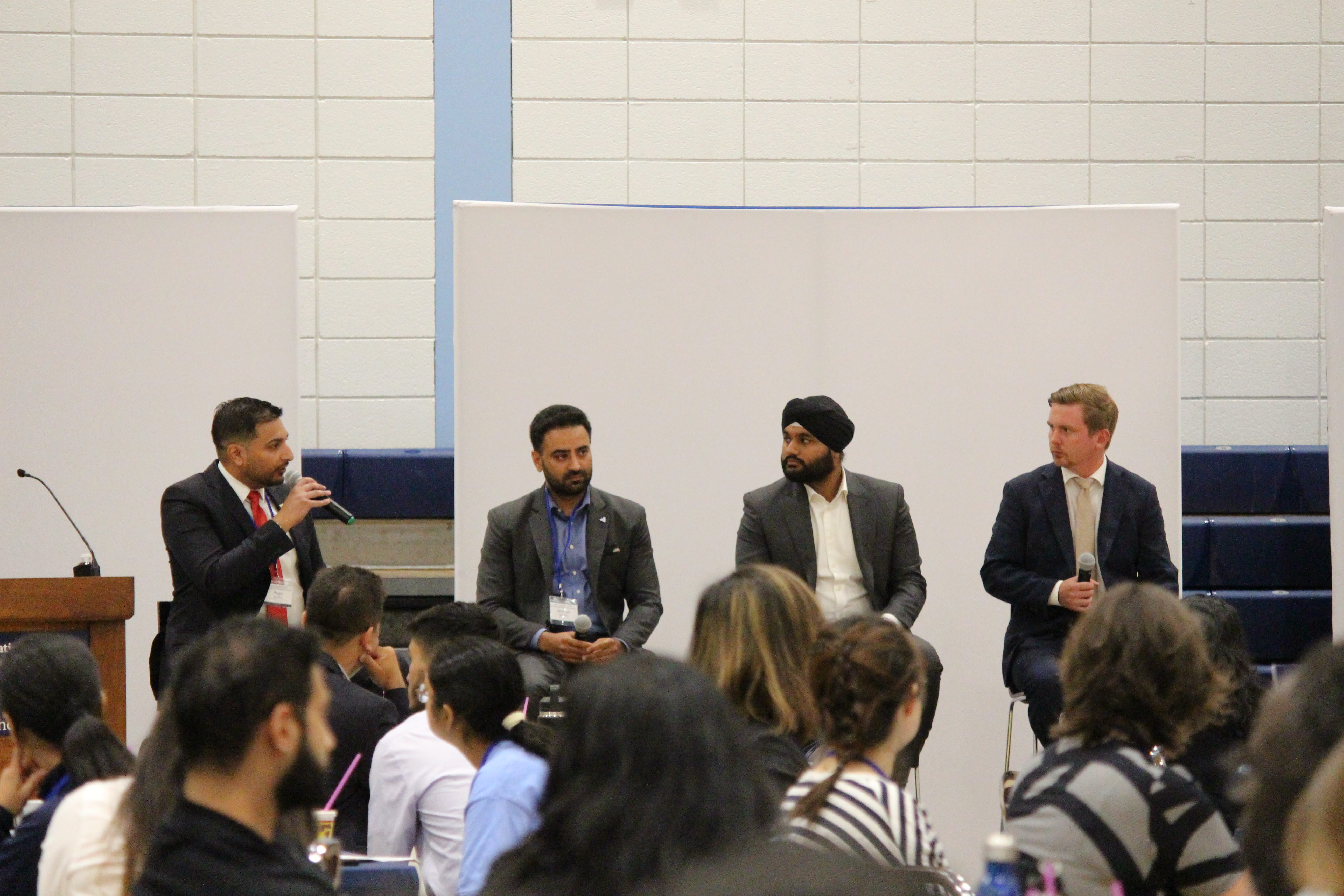 Rajan Sandhu, Sheridan Vice President, Strategic Alignment & General Counsel, moderates a panel discussion with Amarjot Sandhu, MPP Brampton West; Hardeep Grewal, MPP Brampton East; and Graham McGregor, MPP Brampton North.