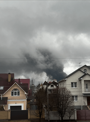 Bottom left: The view from Bohdana's window in Ukraine following an explosion.
