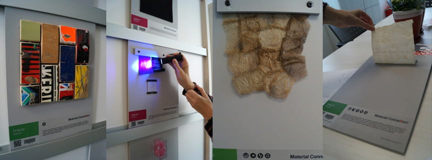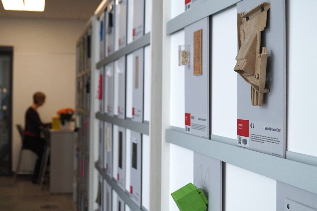 Patricia Buckley, Digital Curator and Special Collections Librarian who played an integral role in the coordination of the library doesn’t hesitate when asked about her favourite materials. She reaches for the bioleather on the top shelf of the ‘Naturals’ section. It’s described on the sample as a ‘tough, flexible translucent sheet made of bacterial cellulose, produced as a secretion from bacteria fed a sugary solution (pineapple juice) in a warm bath.’ “It’s beautiful to look at,” she says, “and being a typical librarian I looked it up in the Sheridan Library’s Material ConneXion database and learned it’s the offcut of a process used in Thailand to make beauty products.”