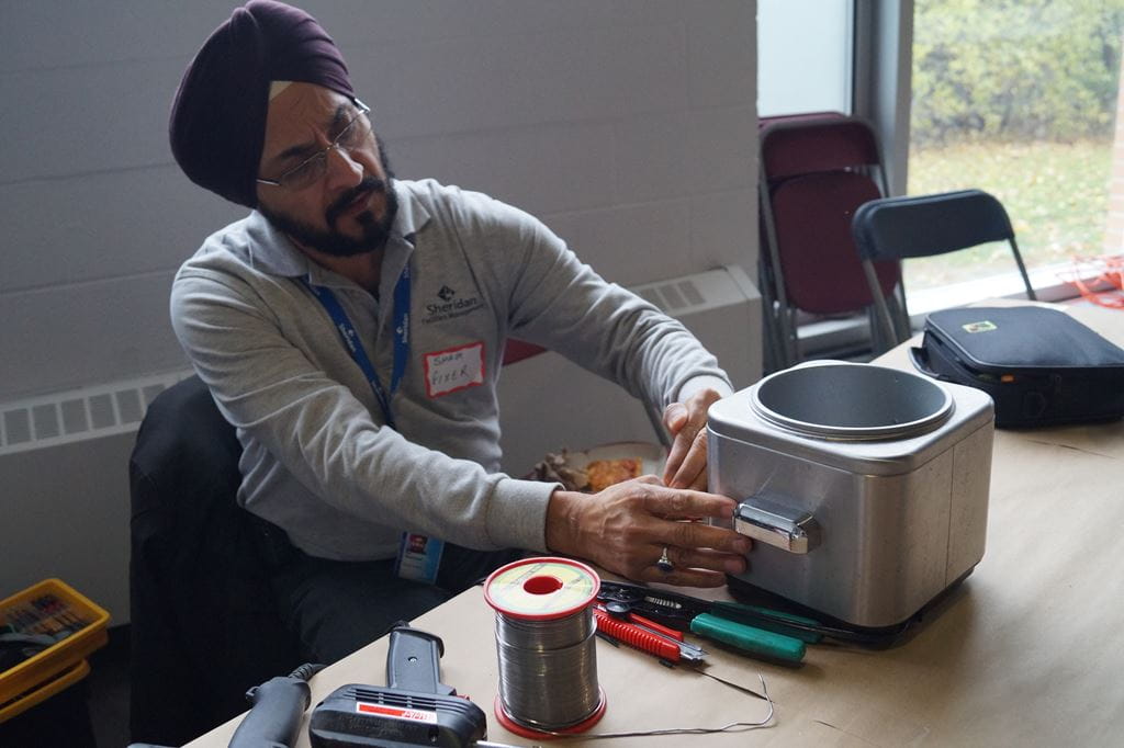 Perhaps as significant as the pile of vacuums, toasters, hair dryers, computers, and clothing that would have been sitting in a landfill if not for these events, is the knowledge gained by the 143 participants who have come through the Café. The event is formatted in such a way that the role of a Fixer includes educating visitors on how to repair their item if it breaks again. “I look forward to these events to test my skills and do my part for the environment, but I also want visitors to save their hard-earned money in the future,” says Shamsher (Sham) Main, a long-time Fixer and HVAC Technician in Sheridan’s Facilities Management Department. Even if a Fixer can’t address the problem on the spot as a particular part or specialized skill is required, participants leave knowing next steps to fix their item.