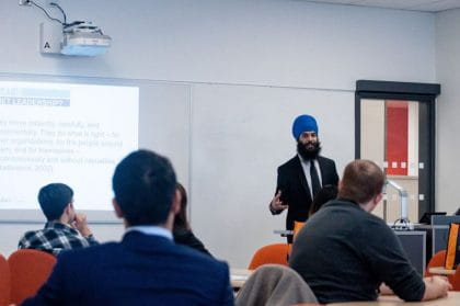 After returning home and “doing nothing” for one year, Dhoot began to rediscover his sense of purpose. Being baptized into the Sikh religion helped restore his confidence, and he enrolled in Sheridan’s Pilon School of Business (PSB) after learning from an acquaintance that the college had begun offering business degrees.