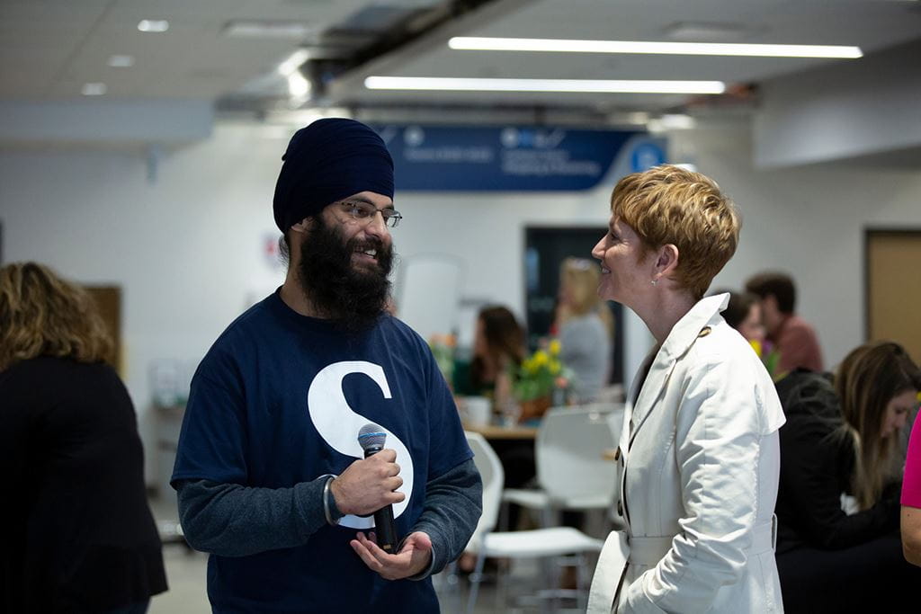 Pictured at top of page: Parmin Dhoot speaks with Sheridan President Dr. Janet Morrison during a College Dialogues event. Photo by Bruce Ladouceur