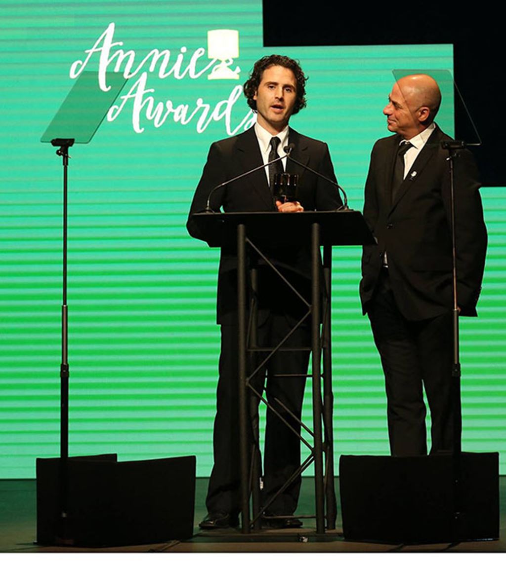 Sheridan alumnus Alan Barillaro (left) accepts his Annie Award for best animated short subject along with producer Marc Sondheimer. Photo credit: David Yeh/ASIFA.