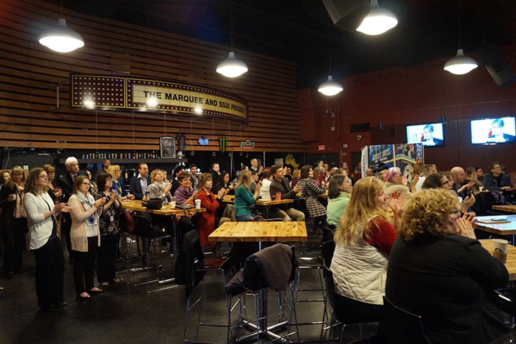 The crowd gathered at Sheridan’s Oakville campus, which is home to the Canadian Music Theatre Project (CMTP), the incubator that first developed and produced Come From Away. They were connected by video link with an audience in Gander, Nfld., so that the two communities, each of whom have a connection to the show, could simultaneously tune in to the live broadcast of the Tony Award nominations to learn first-hand if the show would receive a Tony nod.