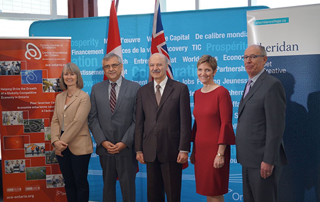 Pictured top right: (Left to right) Linda Franklin, President and CEO, Colleges Ontario; Dr. Tom Corr, President and CEO, Ontario Centres of Excellence; The Hon. Reza Moridi, Minister of Research, Innovation and Science; Dr. Janet Morrison, Provost and Vice President Academic; Brian Jervis, Vice Provost, Research