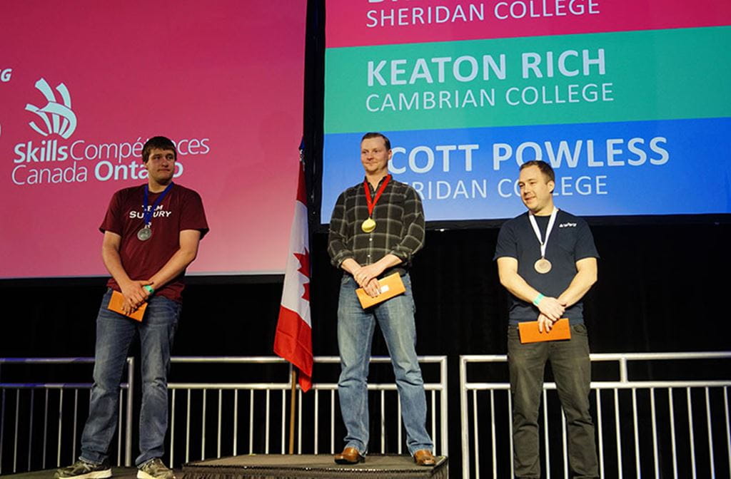 Pictured top right: Industrial Mechanic Millwright award winners standing on a podium at the Skills Ontario Competition closing ceremony. On the left is Sheridan bronze medal winner Scott Powless and in the centre is gold medal winner Brandon Walker.