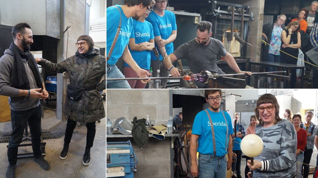 The panel discussion was followed by individual glassblowing demos by both Blown Away artists, as attendees crowded into the Glass Studio to capture a view of the artists at work. David Thai, a well-known glass artist and Sheridan alumnus, gathered glass for Deborah Czeresko as she recreated her award-winning creation from the final episode of Blown Away. Current students in the program also had the amazing opportunity to assist and learn from Rosenberg and Czeresko.