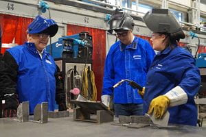 Pictured above left (from left to right): Premier Doug Ford, Minister McNaughton and Carly Myers, professor of welding at Sheridan.