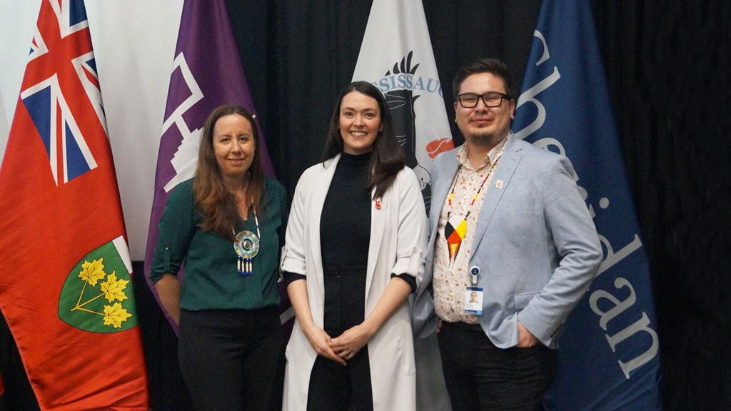 Pictured above (from left to right): Dr. Karine Duhamel, Director of Research from the National Inquiry into Missing and Murdered Indigenous Women and Girls, Commissioner Qajac Robinson, Elijah Williams, Director of Indigenous Engagement at Sheridan.
