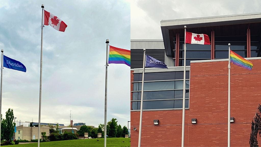 Pictured top right: Pride flags raised at Sheridan's Davis Campus and Trafalgar Campus.
