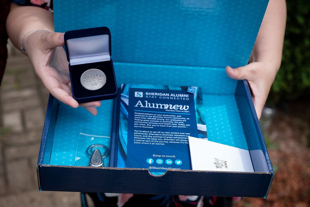 Graduates are receiving a convocation celebratory box, which includes the student’s degree, diploma or certificate and stole, an embossed notebook (with their faculty name), Sheridan keychain, alumni pin, and information about alumni and career services, as well as a digital parchment that can be uploaded to LinkedIn. Those who have earned honours or high honours or completed the Board Undergraduate Certificate in Creativity and Creative Problem-Solving will receive honour cords to reflect their achievement. Students with the best academic record in each program will also receive a Board of Governors Silver Medal in their celebration box.