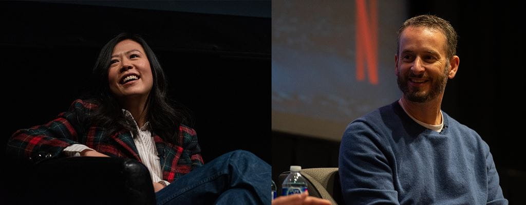 Pictured above (left to right): Sheridan alumna Domee Shi and Sheridan-trained animator Chris Williams, pictured on their visits to Sheridan's Trafalgar Road Campus to speak with Animation students.
