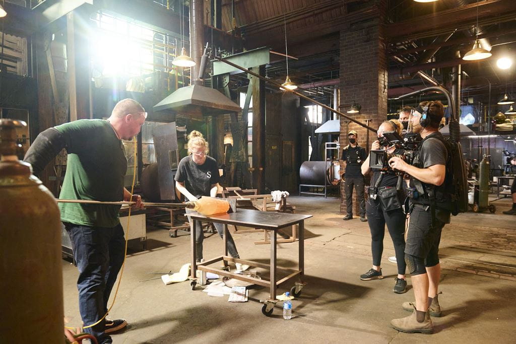 In banner photo, a camera and sound crew capture the action on set of Blown Away, the glass-blowing reality show that features students from Sheridan's Bachelor of Craft and Design (Glass) degree. Season 3 of Blown Away is nominated for Canadian Screen Awards for Best Reality/Competition Program or Series; Best Direction, Reality/Competition; and Best Sound in a Lifestyle, Reality or Entertainment production. Photo by David Lyles.
