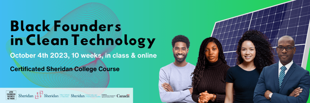 A joint effort between the Afro Caribbean Business Network (ACBN) and Sheridan’s EDGE Entrepreneurship Hub, with support from the Pilon School of Business and Continuing and Professional Studies (CAPS), Black Founders in Clean Technology will be delivered in a primarily virtual format from October 4 – December 6. ACBN is offering up to 10 scholarships for Black founders and aspiring entrepreneurs to help remove barriers to participation.